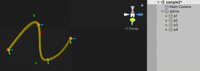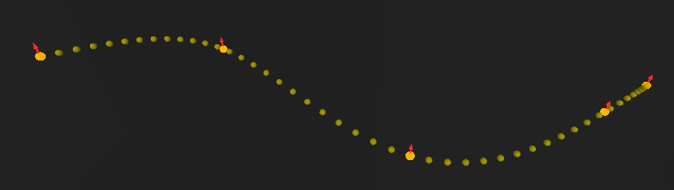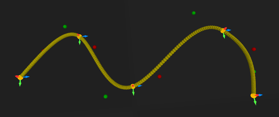 Then, I made a Vector3 GetPoint(float t) function (with t between 0 and 1) that returns a point of the curve. With a N variable that defines the number of points, we can start sampling the curve. Points are drawn in the OnDrawGizmos() function using Gizmos.DrawSphere(position, radius).