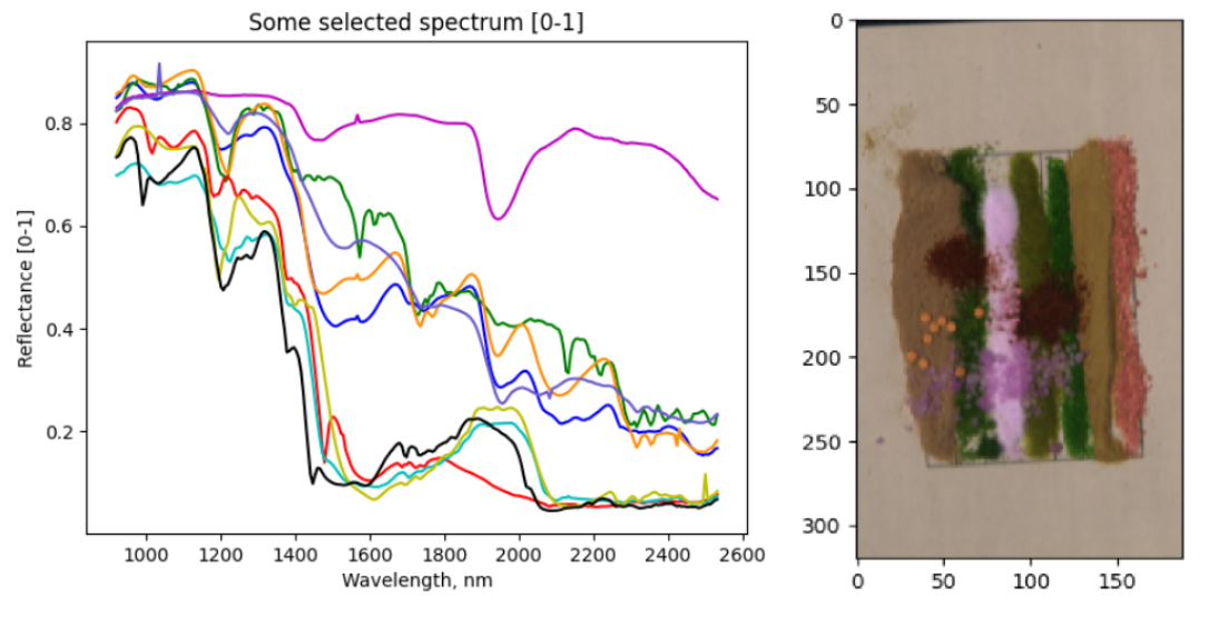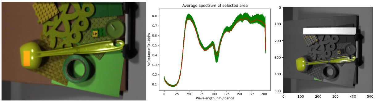Projects for a spectral imaging course at UEF. Spectral images taken using Specim IQ cameras and a scanner, then stored as ENVI. White/dark correction using reference white/dark samples, or white samples that are inside the image. Study of the different spectrum. Segmentation of objects based on their infrared spectra (band-based condition). Tunable and Nuance image formats were also used.