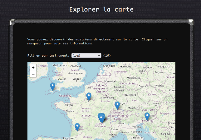 Social network for meeting musicians and forming bands. A Leaflet map can be used to look for people in your area, and filtering by instrument is also possible. Users can upload tracks to show their demos. A MySQL database is used in back-end.